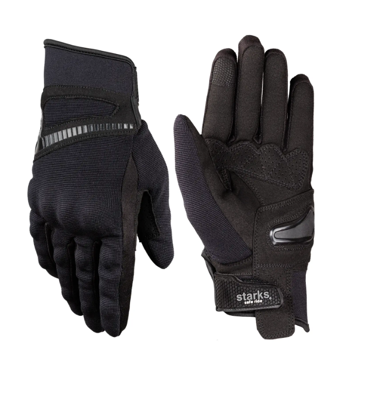 Короткие текстильные продуваемые мотоперчатки с жёсткой защитой костяшек пальцев и основания ладони. Материал изготовления – прочный полиэстер, ладонь изготовлена из искусственной замши. Зона контакта с грипсами руля и внешняя сторона большого пальца усилены вторым слоем замши. Термоформованный пластиковый щиток с мягкой ударопоглощающей подкладкой защищает костяшки пальцев. При сгибании пальцев в кулак, щиток садится точно по руке, не давит. Основание ладони защищено от синяков и ссадин жёстким щитком из литьевого пластика. Есть мягкая защита фаланг пальцев. Манжета застёгивается на липучку и плотно охватывает запястье руки.