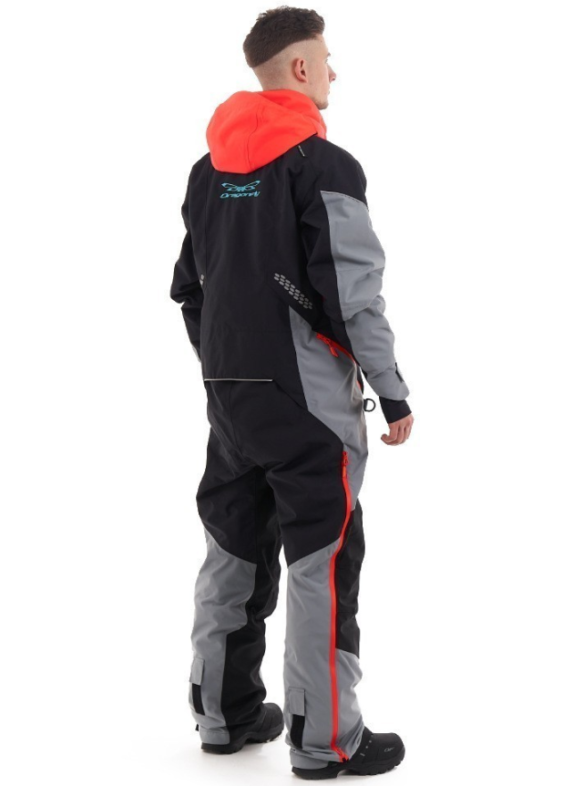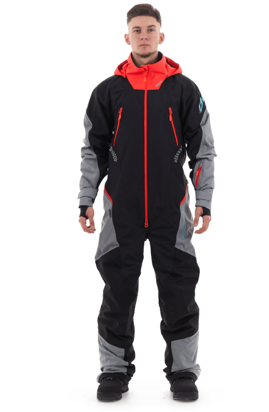 Комбинезон предназначен для снегохода, сноубайка и сноуборда. Надежно защитит от ледяного ветра и мокрого снега: ткань верха содержит водоотталкивающее покрытие. Внешние молнии влагозащитные. Проклеены все швы. На рукавах есть эластичные манжеты, на штанинах – снегозащитные "юбки" с петлёй для фиксации к ботинкам. При закрытой вентиляции и карманах комбинезон герметичен.